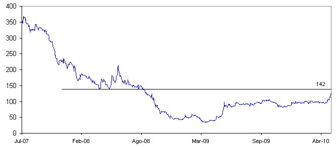 Ayer con Chelost revisando hacia atrás se llega a una posible resistencia en 135, por mínimos de 2 soportes en la baja del 2008, y a 138 si se toma el precio de cierre de ambos soportes.