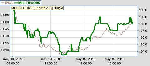 A continuación hago una comparación Ipsa vs Multi para el día de hoy, anduvo de la mano con el ipsa. Esto quiere decir que con el repunte final quedamos casi neteados... Pero claramente existió un gran cantidad de transacciones que se movieron hasta que encontró un piso $123,5, es decir, muchos salieron para asegurar ganancias (corrección!).