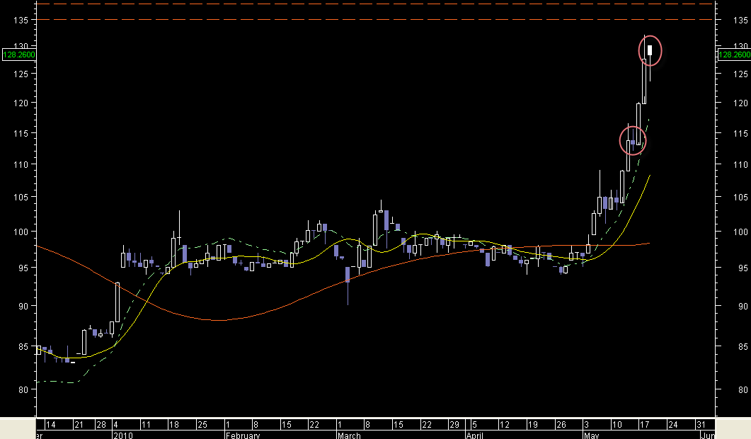 Bien, mirando el chart del papel, nos encontramos primero con sus 2 resistencias (135; 138) analizadas con litio. Por otro lado, marque en un circulo lo ocurrido 14-05 (idem al intraday de hoy) "sus correcciones!".