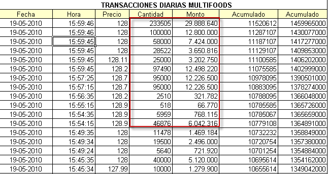 Al final del día existieron altos nivel de transacciones, en los últimos 10 minutos se ejecutaron $100 millones... esto ocurrió en la vuelta del intraday... la pregunta ¿Por que gran cantidad de trx's últimos minutos?... personalmente creo que están apostado a que corrigió y que con la vuelta puede comenzar a avanzar nuevamente. Adicionalmente existen los condimentos comentados por posible compra peruana.