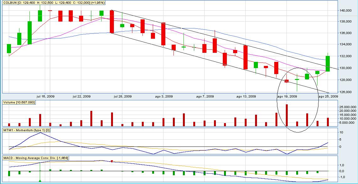 Andreas en este momento diras.."por que no entre a 129??""...haber entrado a COLBUN ese dia hubiera sido una loteria..el riesgo solo te puede llevar a mas derrotas...solo ponte a pensar y espera una oportunidad para entrar a un papel q te diga algo...este papel como se ve en el circulo hizo un martillo invertido el dia jueves con buen volumen...pero no es suficiente..esa vela es importante,pero como todas merece confirmacion...la semi confirmacion estuvo ayer con el martillo que valido hoy rompiendo en canal bajista apoyada con buen volumen