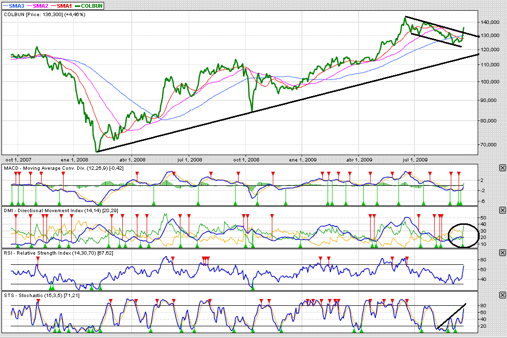 Hola, quiero compartir con ustedes el AT de este papel. Hasta la semana pasada la acción estaba en un canal bajista y por debajo de sus medias de mediano plazo de 20, 50 y 100 días. El impulso del contrato con codelco llevo a la acción a salidar de este canal, y con un aumento prologando del volumen. La inquietud que tengo es que sí realmente comienza a tomar "fuerza" un canal alcista debido que el ADX aun no lo confirma... veamos que pasa.