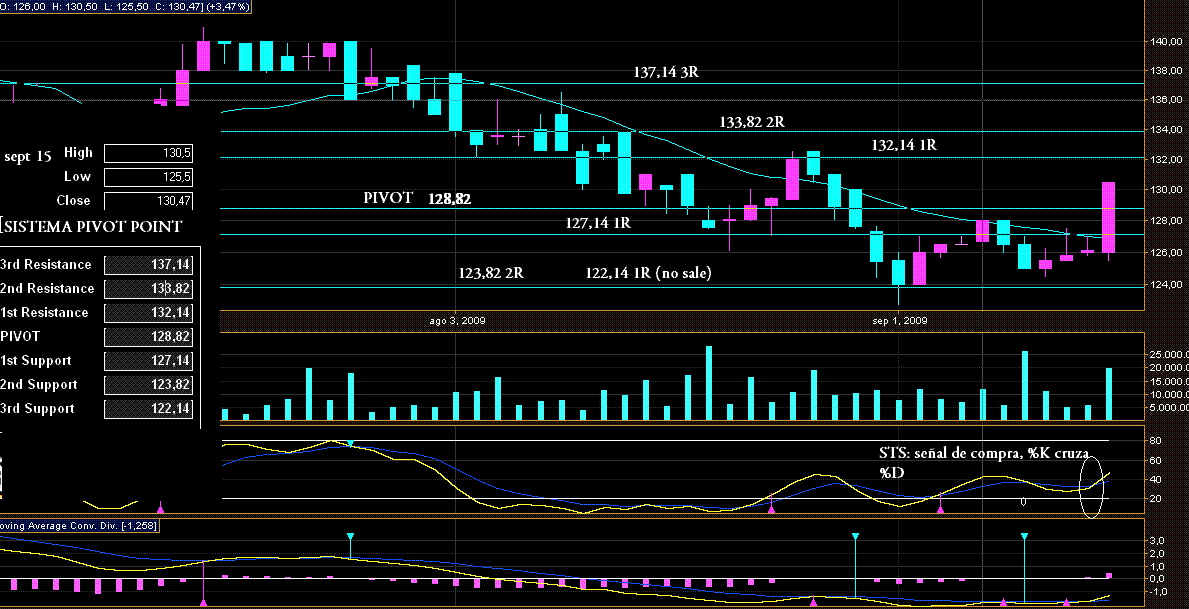 Para los que se interesan en el seguimiento de la repentina alza de este papel, el sistema Pivot Point determina 3 resistencias y 3 soportes y el Pivot para la sesion de mañana, en base a los datos del high, el low y el cierre de hoy.