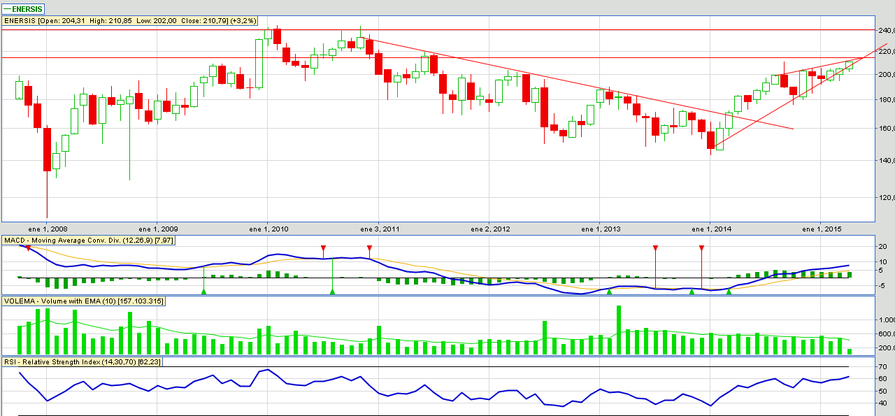 En un sistema de trading "bueno" tú sólo aumentarías posición cuando la acción sigue subiendo y confirma tu análisis, o bien (si eres más kamikaze) cuando a pesar de que ha bajado el precio, tu análisis te dice que hay señales que indican volverá a subir. Por ahora no se da ninguna de las circunstancias así que mejor seguir con lo que tienes y preparar tu salida en caso que siga bajando. Insisto en que sólo en 205 me sentiré cómodo comprando (considerando la directriz alcista que tiene Enersis desde inicios de 2014).