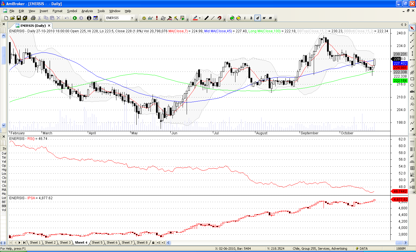 Estimado Litio; una consulta respecto a los gráficos (partiendo de la base que estoy aprendiendo de esto)...el segundo grafico no entiendo lo que haces y que muestra...en el último cuando restas Enersis con el IPSA, cual es la idea?..creo entender que muestras graficamente la evolución del papel respecto del mercado..es así... algo asi como la velocidad del papel.... porque ambas podrían estar en una tendencia a la baja, pero si el IPSA lo hace más lento (porcentualmente me refiero) la pendiente de la diferencia igual sería positiva, aunque el papel este bajando, pero lo hace con una pendiente menor que la del IPSA.... es así. Ojala me puedas aclarar el concepto.