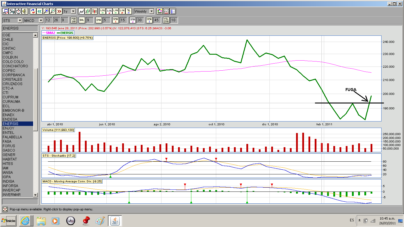 Betozamo, la fuga ya se produjo según el gráfico, lo importante es que ahora la confirme con un rebote sobre su nuevo soporte, si bién es cierto que no se produce sobre su MM30 semanas por lo cual Stan W. no la recomendaría para un inversionista, yo si la veo buena para operadores de CP como nosotros, incluso de MP (a pesar de que algunos defienden la MM30 semanas, creo que S.W. consideró otro tipo de mercado y otro momento en el comercio mundial). Las eléctricas en general son una buena opción para este año, hay quienes hablan de un año seco, sin embargo no consideran que estas empresas estan rezagadas del rally del año anterior, además tienen una posición estratégica en chile y el mundo (la energía cada día es más vital para el desarrollo de una nación), y por último como pueden saber que será un año seco, aca en mi tierra ya comenzaron las lluvias apenas terminó el verano.