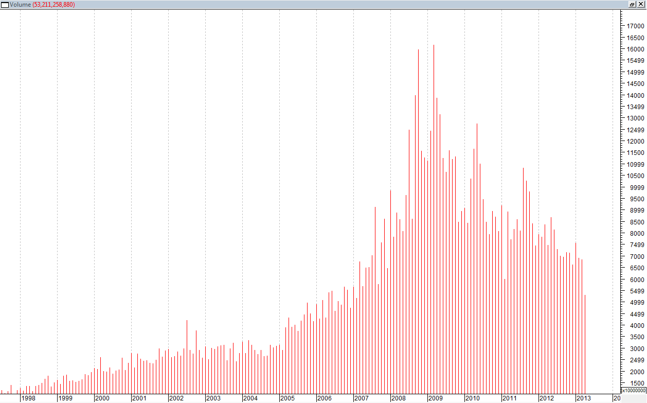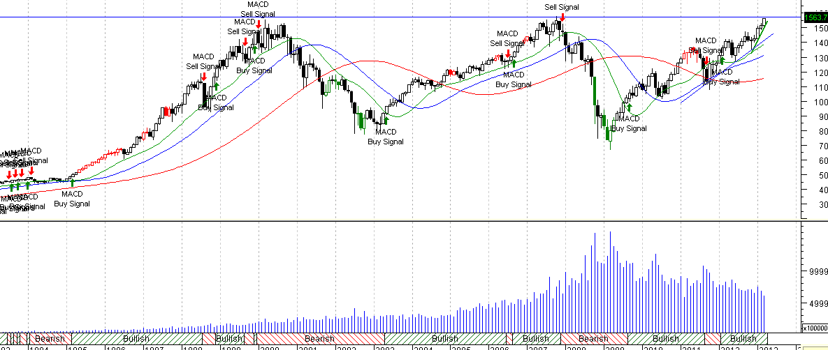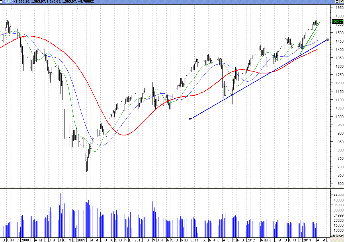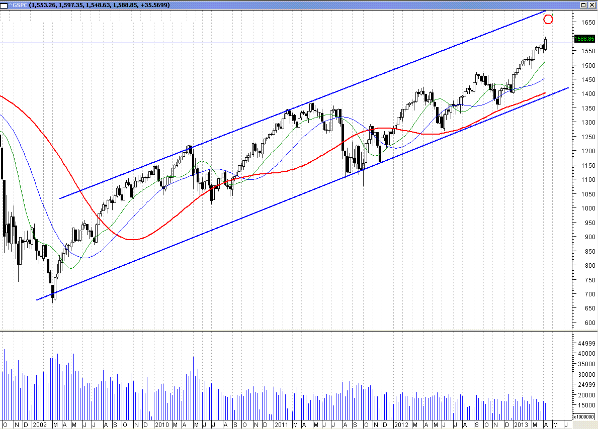 SP 500 en semanal, canal ascendente iniciado en marzo del 2009, probablemente irá en busca de su techo ubicado a nivel de 1.650- 1.680... un poco ambicioso esperar que suba tanto no?, a veces me acuerdo de las palabras de Greenspan cuando hablaba de "exhuberancia irracional de los mercados".....Bueno, dejemos que sea el tiempo el que de su última palabra.