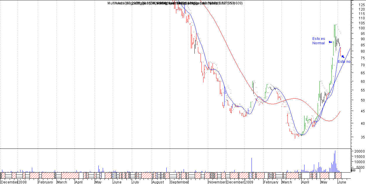 Segundo. Los que operan en el corto plazo deben tratar de salir lo más cerca del top posible (salir en el top consistentemente es casi imposible por lo que se debn esperar señales como consolidaciones de corto plazo o reversals). Si bien las pausas siempre se pueden dary permitir reingresar, tal como en el gráfico de Paz, nunca son pausas hasta que podemos definir un día de escape de la pausa hacia arriba. Si uno entra en la pausa misma corre el riesgo de que el retracement llegue mucho más abajo y corre el riesgo de quedar atrapado en una posición en donde, si bien se supone que hay un futuro, el tiempo puede pasar sin que nos de lo que entramos a buscar. Y el tiempo es un factor muy relevante cuando se invierte a corto plazo, debido al alto costo de oportunidad que se genera. Este ejemplo es perfecto debido a que se dio la pausa, con zona de tráfico normal, pero el escape que sucede es contrario a lo que estabamos esperando, apunta hacia abajo en vez de hacia arriba... no es lo normal, o al menos no lo que queríamos que fuera lo normal...