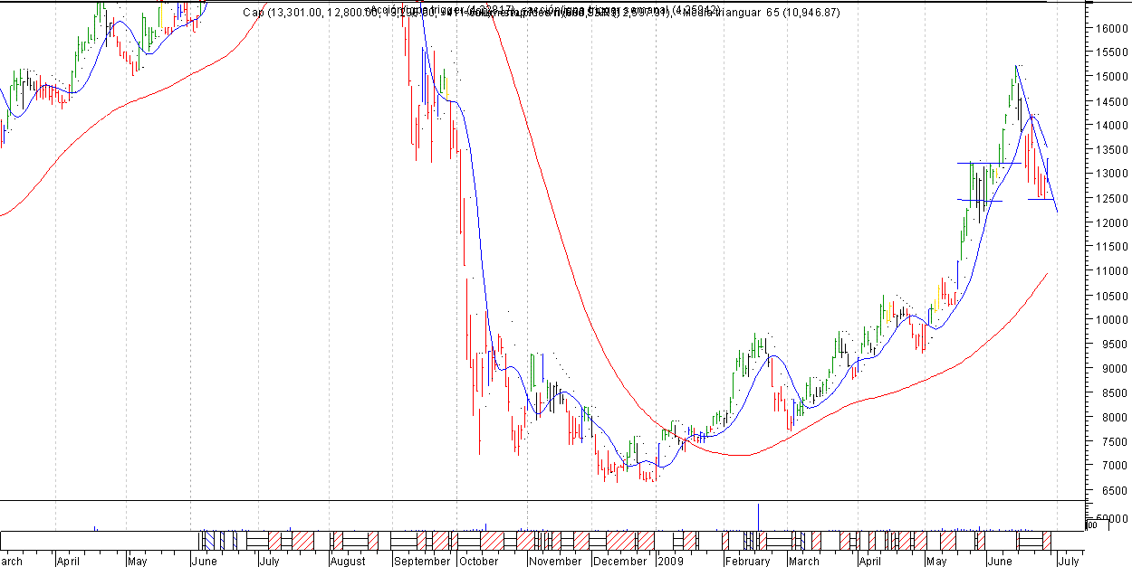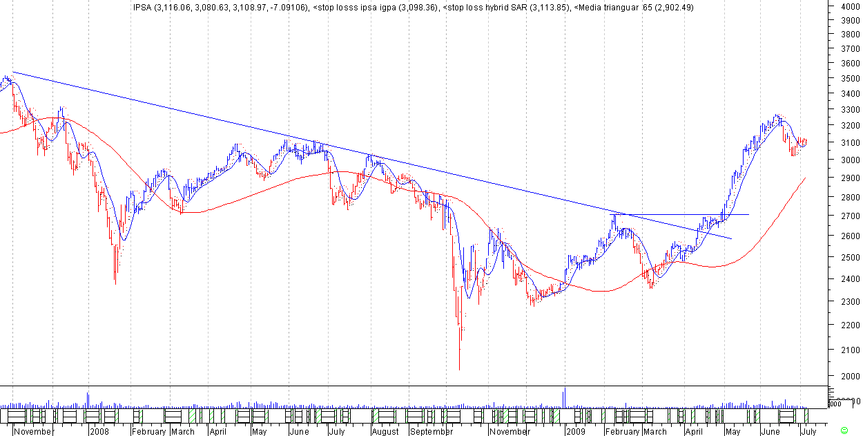 Como pueden ver, Cap se tomó en serio esta corrección de corto plazo del ipsa. Sin embargo, la corrección tiene señas de que puede haber terminado  y Cap ha vuelto a dar señales de vida. Vemos que la caída libre en la que estaba envuelta ha formado un pequeño piso, bastante consistente con la parte baja de una zona de congestión anterior, y ahora ha sobrepasado el máximo de esa zona lo cual nos habla de fortaleza, y de que lo más probables es que tenga impulso para al menos atacar su máximo previo. Como pueden ver en la línea roja, la media triangular  de 65 periodos sigue intacta (desde hace mucho tiempo) lo que indica que la tendencia de mediano plazo es un go aún. De todas maneras, dado la extensión de los últimos movimientos, se ha quedado algo retrasada por lo que por ahora servirá más utilizar la definición básica de tendencia como stop: máximos relativos al alza y mínimos relativos al menos en el mismo nivel. Por ahora aún parece que vale la pena tanto en mediano como en coro plazo, que vale la pena correr el riesgo. Sin embargo recuerden que están hablando con un papel que ha entrado en zona de  movimientos extensos, por lo que no contar con un buen stop puede resultar bastante nefasto. Si me pusieran una pistola al pecho tal vez yo la compraría hoy, pero con cuidado y sin enamorarme.