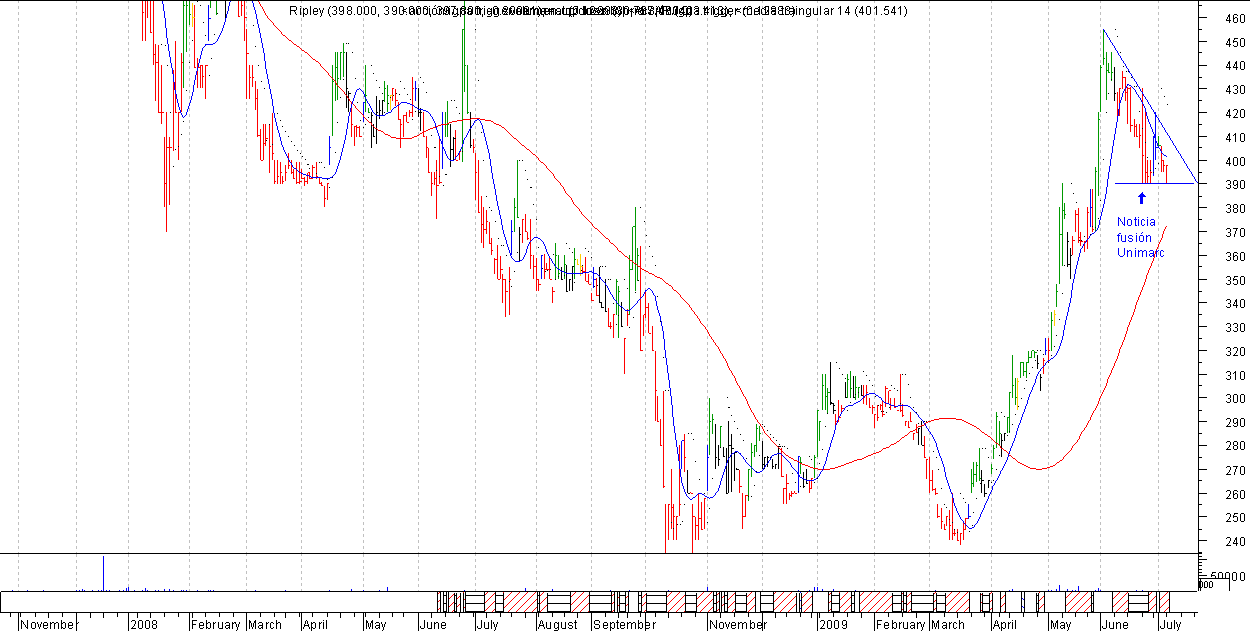 Ripley comenzó su corrección justamente cuando al ipsa se decidió a no subir más. Fue junto con La Polar, la estrellita del retail, sin embargo su corrección ha sido prolongada y relativamante ordenada, y ni siquiera la noticia de fusión (luego desmentida) tuvo la fuerza para cambiarle la dirección. Como ven, cuando el mercado va a la baja se lleva a casi todas consigo. A Pesar del triangulo que muchos podrían ver, de las tres analizadas, es la que tiene menos cara de retomar hasta ahora por lo que, con la información con que se cuenta hoy, puede que si el mercado retoma su rally, ripley no sea de las que lo inicie. Esto, por supuesto, no es lo ideal para entrar, aunque permitirá a algunos que se queden fuera en el comienzo del rally (si es que sucede, ojo... dije anteriormente que esta es una decisión que el mercado aún no toma) entrar al principio de un  movimiento pensando en que dejará pasar varios papeles en su duda.