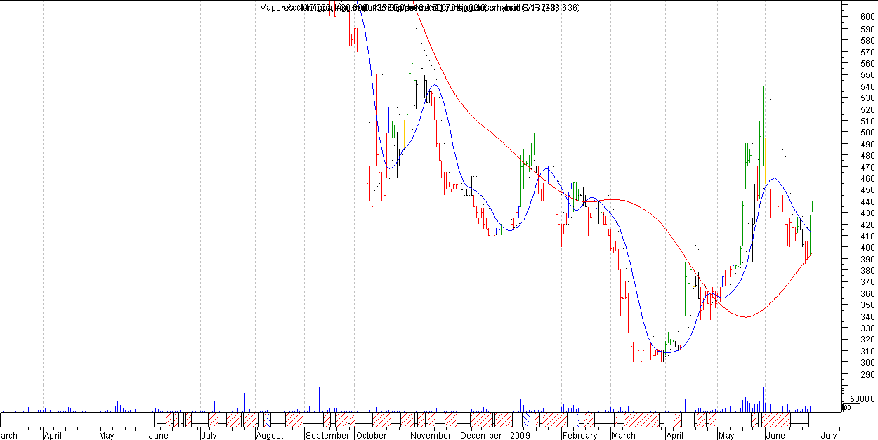 Si observan bien el gráfico, vapores ha sido de esos papeles que se leen por si mismos. Ni siquiera ha sido necesario dibujar línea de ningún tipo. Para el corto plazo la media triangular de 13 periodos ha sido un excelente indicador y en general ha vivido de impulsos verticales y no de tendencias con pendientes más bajas. Sigue siendo una muy buena opción de mediano plazo tanto si definimos una media para realizar su lectura o si comparamos mínimos y máximos relativos. Para el corto plazo, sin embargo, debe primar la cordura y el miedo. Como dije, ha sido una acción que ha vivido de impulsos lo que provee de buenas oportunidades para hacer lucas fáciles y rapidas, pero también genera formaciones que, si el timing es errado, suelen dejar atrapados a los que no están atentos. Ayer fue el primer día que da señal de entrada en casi un mes y se pueden abrigar esperanzas de que llegue algo más lejos. El gap que realizó hoy en la apertura así lo indica, pero la recomendación es a usar un triling stop loss muy ajustado, y a proteger las ganancias de manera cuasi paranoica. Yo he entrado 4 veces a este papel en el último tiempo... he salido mínimamente herido en dos oportunidades y, grandemente compensado en otras dos. Ayer retomé nuevamente una posición... lo que hay que considerar es que cuando uno es de corto plazo, y se queda calvado 1 mes sin ver resultados correr el riesgo de que  al final estos no lleguen y además, se pierden otras oportunidades que puedan surgir en el intertanto (que es al final igual de dañino que quedarse en una posición perdedora). Así que, a tener ojo con los impulsos verticales de este papel y a no tener miedo a cerrar la posición rápidamente para tomar lo que nos hemos ganado.