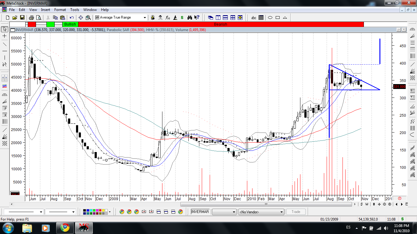 Como lo menciona Alex, creo que la figura ya está invalidada, ya que el banderín es una figura de continuacion de tendencia, es decir aun hay interes del mercado bullish, lo que le da dinamismo, el triangulo debe desarrollarse antes de 3/4 de este, ya que la idea es que sea lo mas rapido posible, entre mas se acerca al final, quiere decir que mas fome está y que el mercado no le cree tanto a los toros. En este caso de invermar, no quiere decir que no vaya a volver a generar buenas tendencias, si no que el banderín queda invalidado y hay que esperar otras señales de entrada, la mas evidente es que rompa el canal por arriba (378) y con fuerza.
