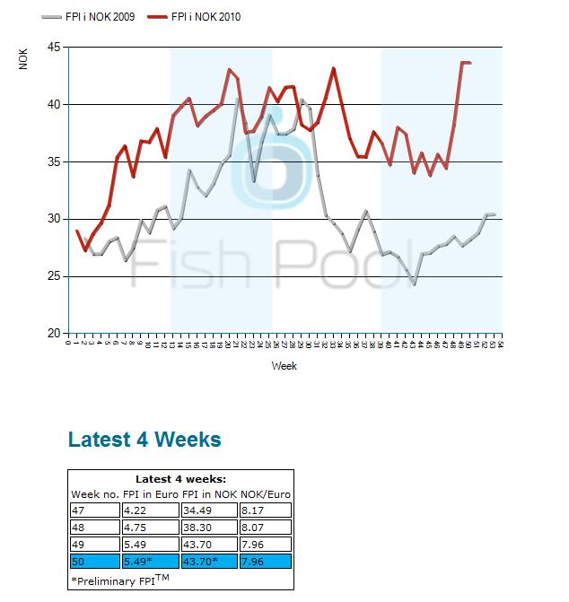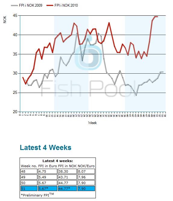 Informacion sobre los precios del Salmon Atlantico del Index de Fishpool, de Noruega... tambien hay un cuadro de las ultimas 4 semanas.