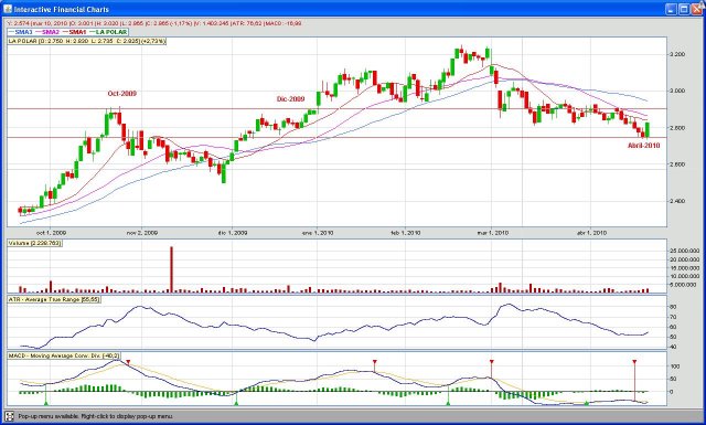 Es posible que algunos estén especulando y finalmente el precio de La polar caiga en los próximos días, erroneamente a mi juicio, por una coyuntura derivada del terremoto. Pero así es la volatilidad del mercado, el cual siempre tiende a estabilizarse, los PO de varias corredoras, dan por sobre los $3.300, y no se basan totalmente en AT, sino en proyecciones de venta y estado de la empresa (análisis fundamental). Es de esperar que el alza empiece en mayo, post entrega de dividendo ($56/acción).... suerte y éxito.