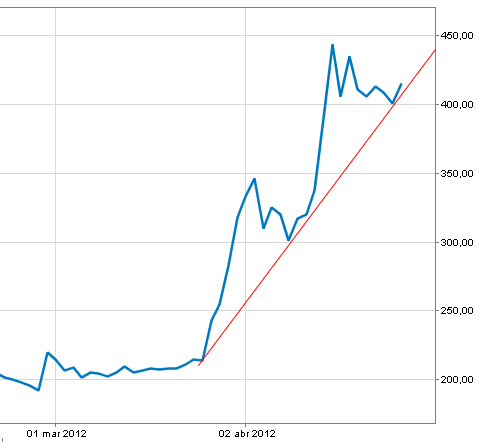 Porque si dibujamos una línea, por ej., que conecte el precio del 27 de marzo y el del 11 de abril, parece ser que hoy estaríamos apenas rozando la tendencia, con posibilidad de estar dando inicio a un rebote.