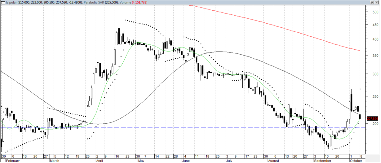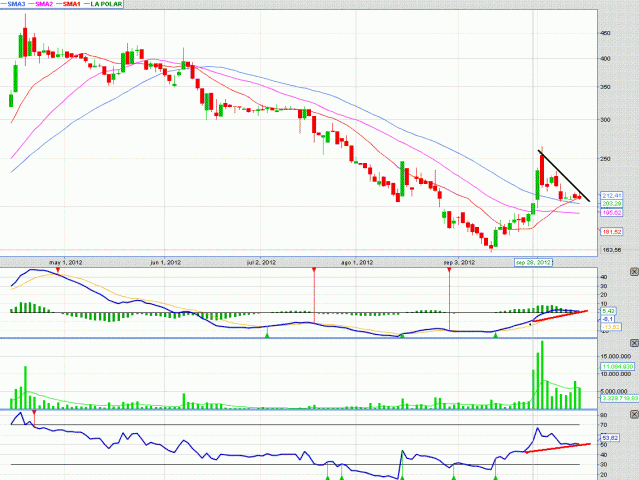 Según lo que e leído en el foro, las acciones preferentes asignadas por el aumento de capital van a ser liberadas el día 16 de octubre. Tomando esto como cierto (no lo e ratificado), supuse que durante esta semana la acción se refugiaría en el soporte que mencionan, sin embargo veo como solo en dos días los accionistas se han desprendido rápidamente de sus papeles y con ello ya la dejaron en los $205.......El pero, es que aún queda casi toda la semana, por tanto de no cambiar las condiciones que fuerzan esta baja, la acción debería caer un poco mas, tal ves primero veamos algún rebote, pero luego seguiría su tendencia, es aquí donde visualizo los $190 como el siguiente soporte......La pregunta es; ¿Si al cierre de la semana la acción cae a este último valor, hasta donde puede llegar cuando se venga la avalancha de acciones el próximo 16 del presente?..........