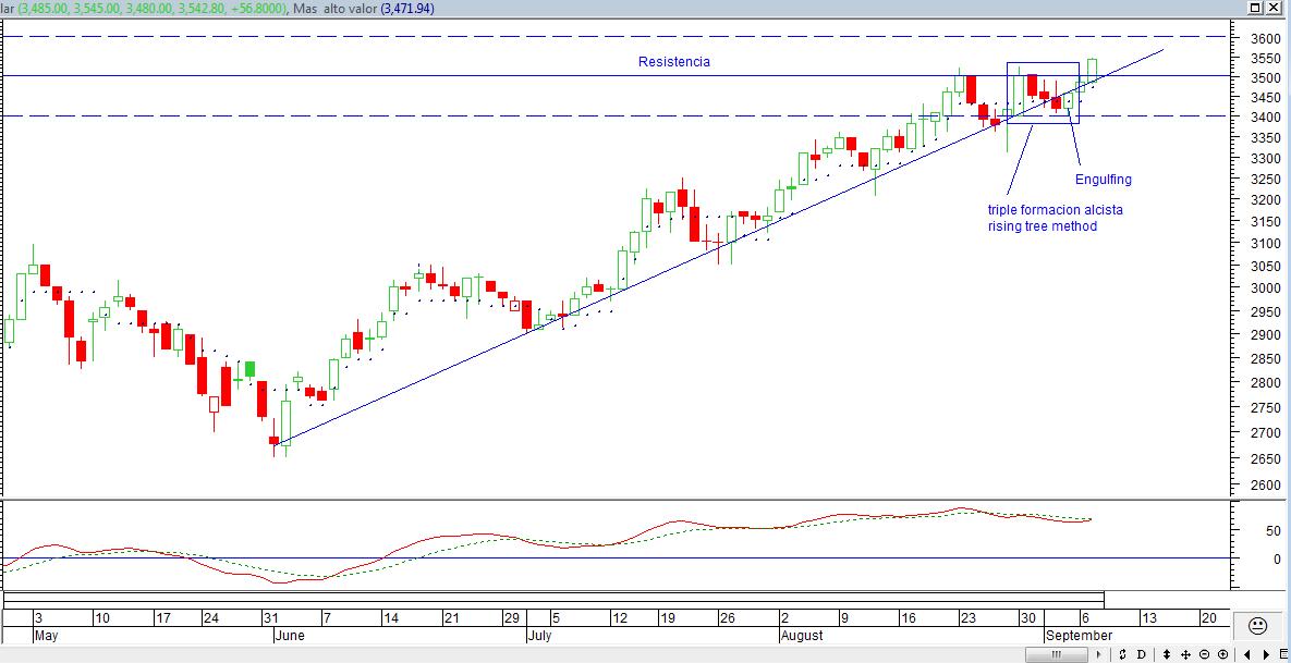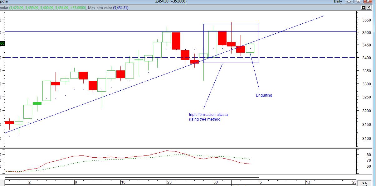 La vela grande del dia Lunes que abrio en los 3400 debia ser un soporte importante para un posible rebote y asi se confirmo, la accion apenas toco los 3400 subia.