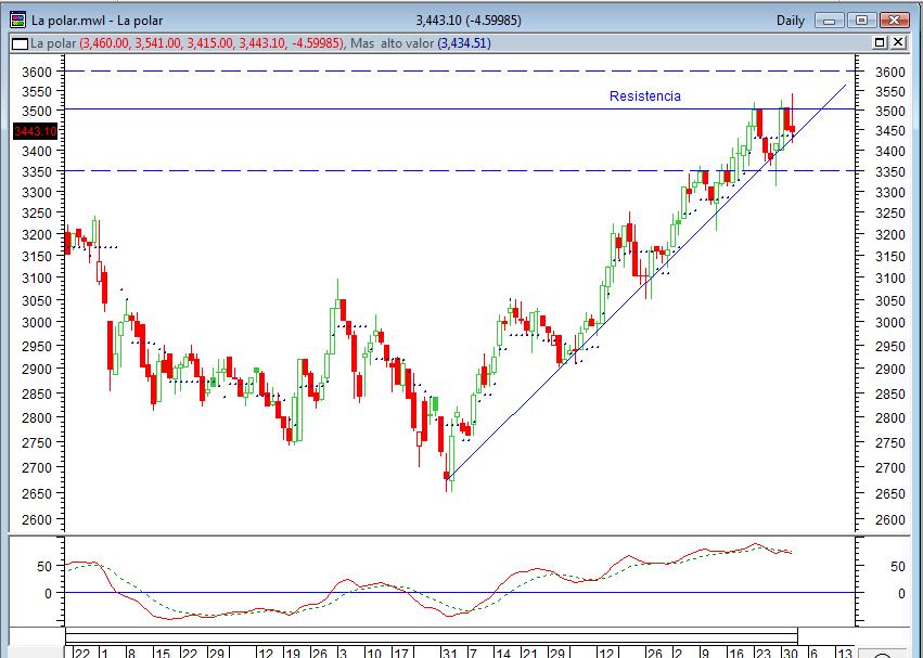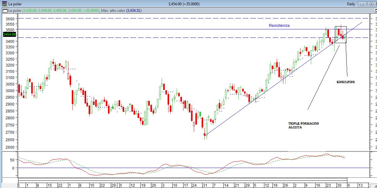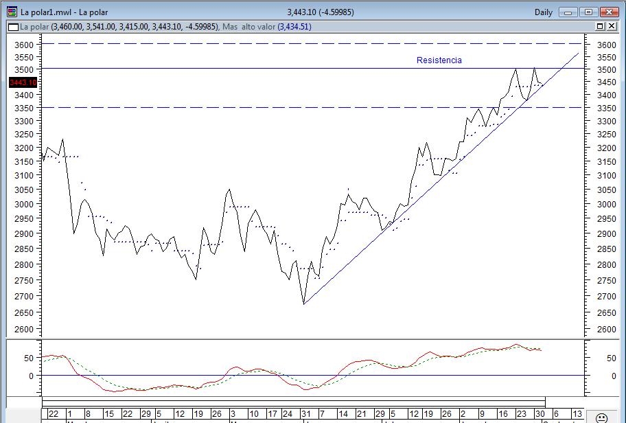 Bueno continuendo con la teleseria de La polar, finalmente rompio su resistencia de los 3500, comportandose muy bien para ser un dia rojo. esperemos que este soporte ahora sea fuerte y no bajemos de una. Dia feliz, siguio su LT, las figuras se comportaron como tal, el triangulo que se formaba entre la LT y la resistencia finalmente no soporto mas el empuje de la accion.