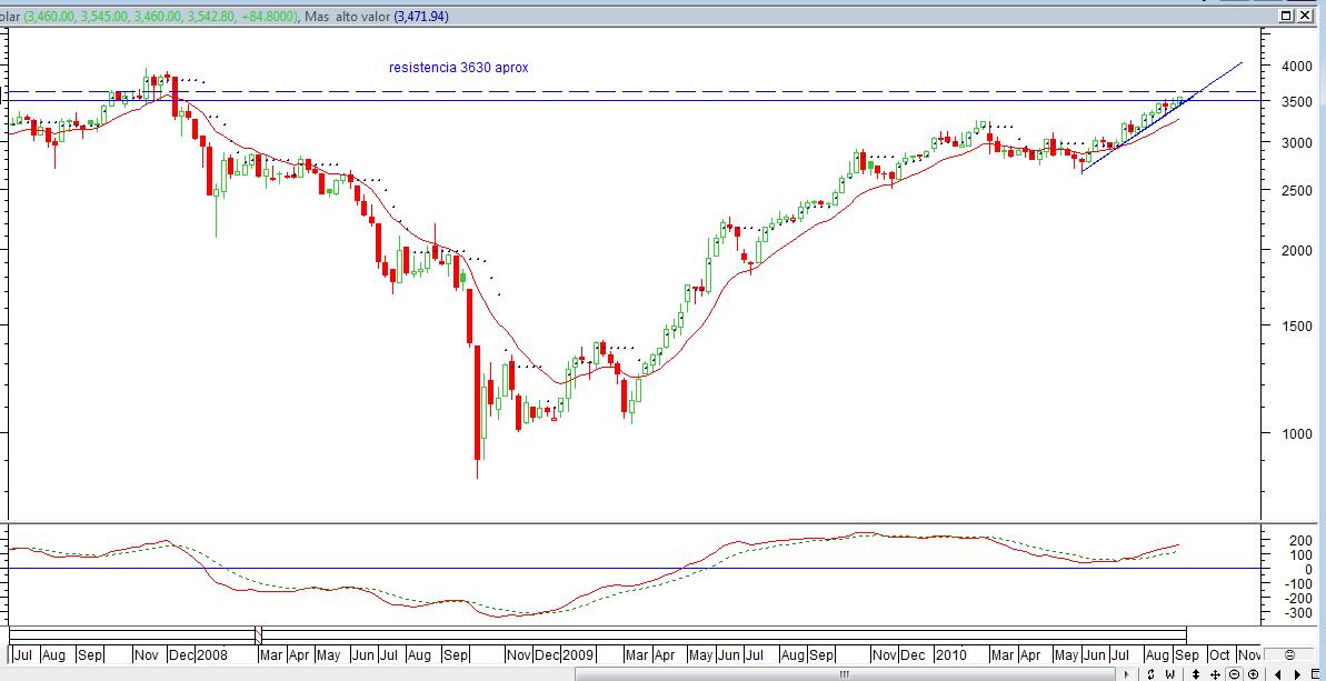 Me parece que la resistencia esta en orden de los 3630, justo donde empezo a dudar hoy, la siguiente sera el maximo historico que tenia, pero ya eso es para mas adelante, primero los 1630.