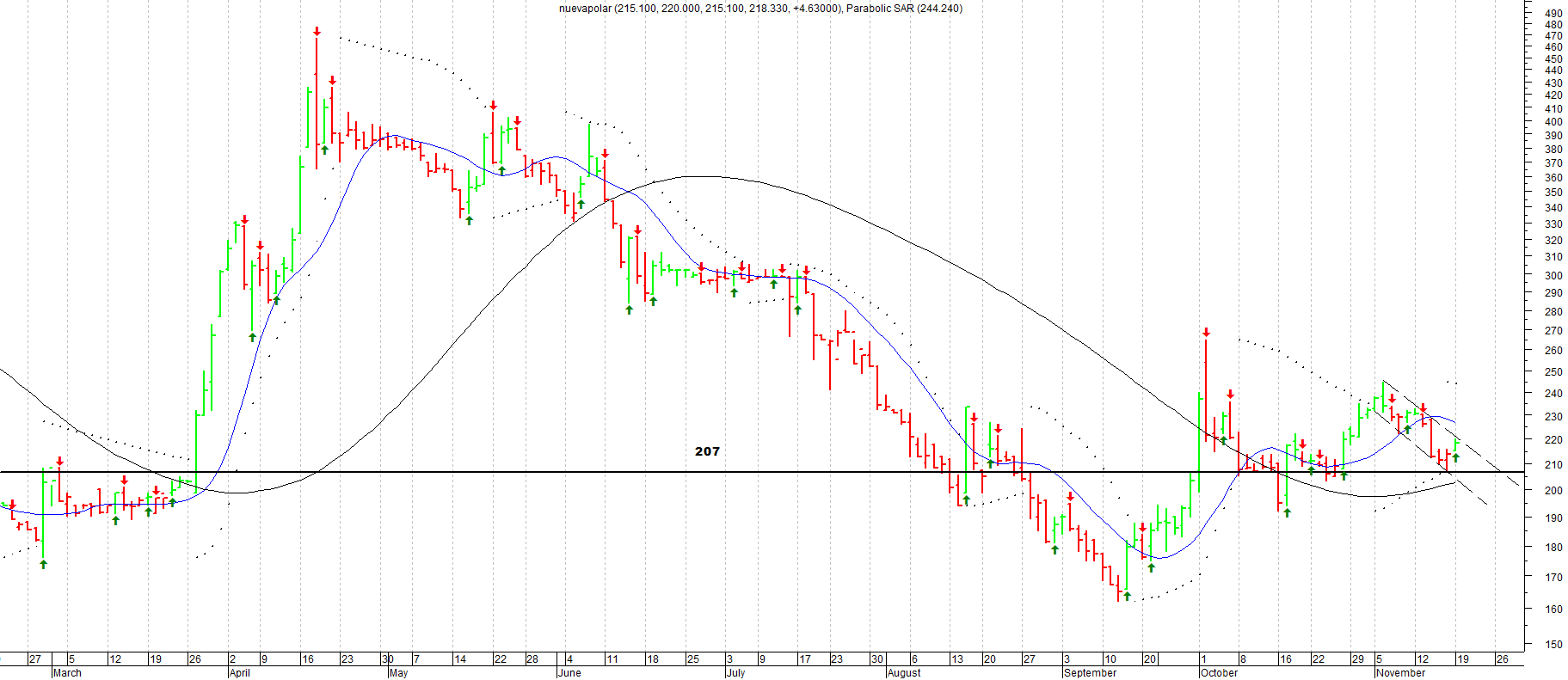 3.- En algunos casos el oscilador MACD permite clarificar cual es el futuro de Nuevapolar y el oscilador lamentablemente presenta una divergencia negativa, signo de que la fuerza del movimiento anterior se esta agotando.