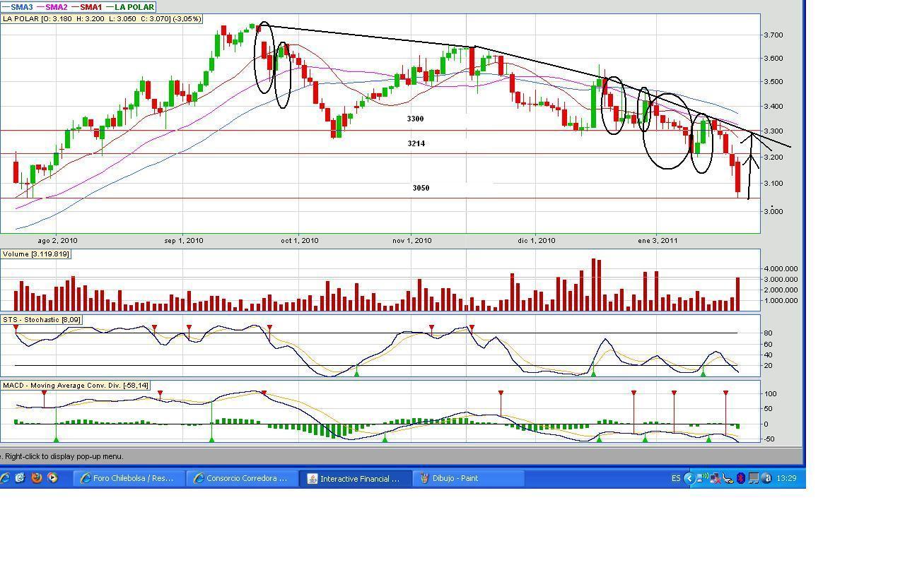 Puede que pase algo en este papel, claro, de tanto caer en algún punto va a rebotar, pero?, cual será ese punto?. Muchos puntos se le han dado a este y otros papeles (como vapores) en que iban a rebotar y que ha sucedido?, los pseudo soportes no aguantaron nada y claro, aquí actuó el mismo principio que en las alzas, un papel en tendencia alcista lo mas probable es que continuará su senda y uno con tendencia bajista sucederá lo mismo, en sentido contrario.