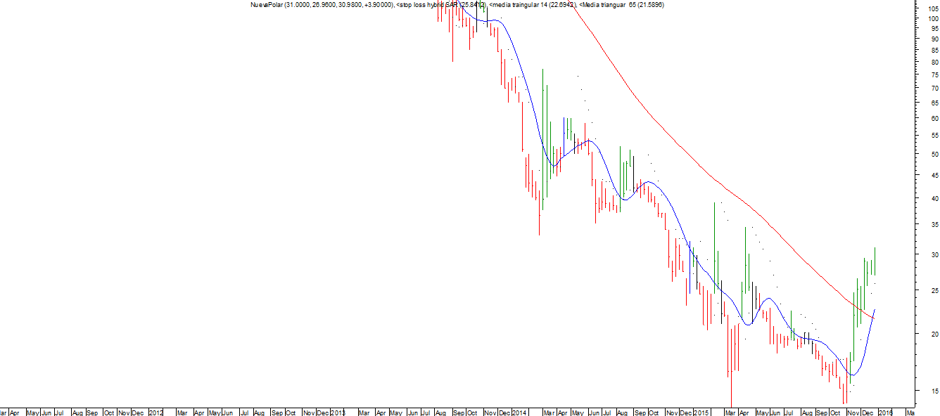 NuevaPolar, semanal, semilog, 8x en el eje Y (siempre uso 4x en el semanal, pero NP se merece una visión más amplia ya que se mueve muy rápido), vela casi terminada.