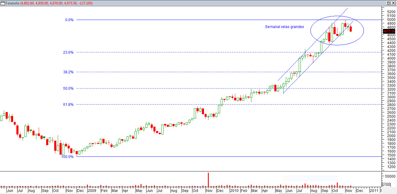 Acá nuevamente en el semanal aparecen velas grandes, señal de precaución, igual que en cenco. Se observa una subida continua sin descanso importante, de caer primer soporte se ve en el retroceso del 23,6%