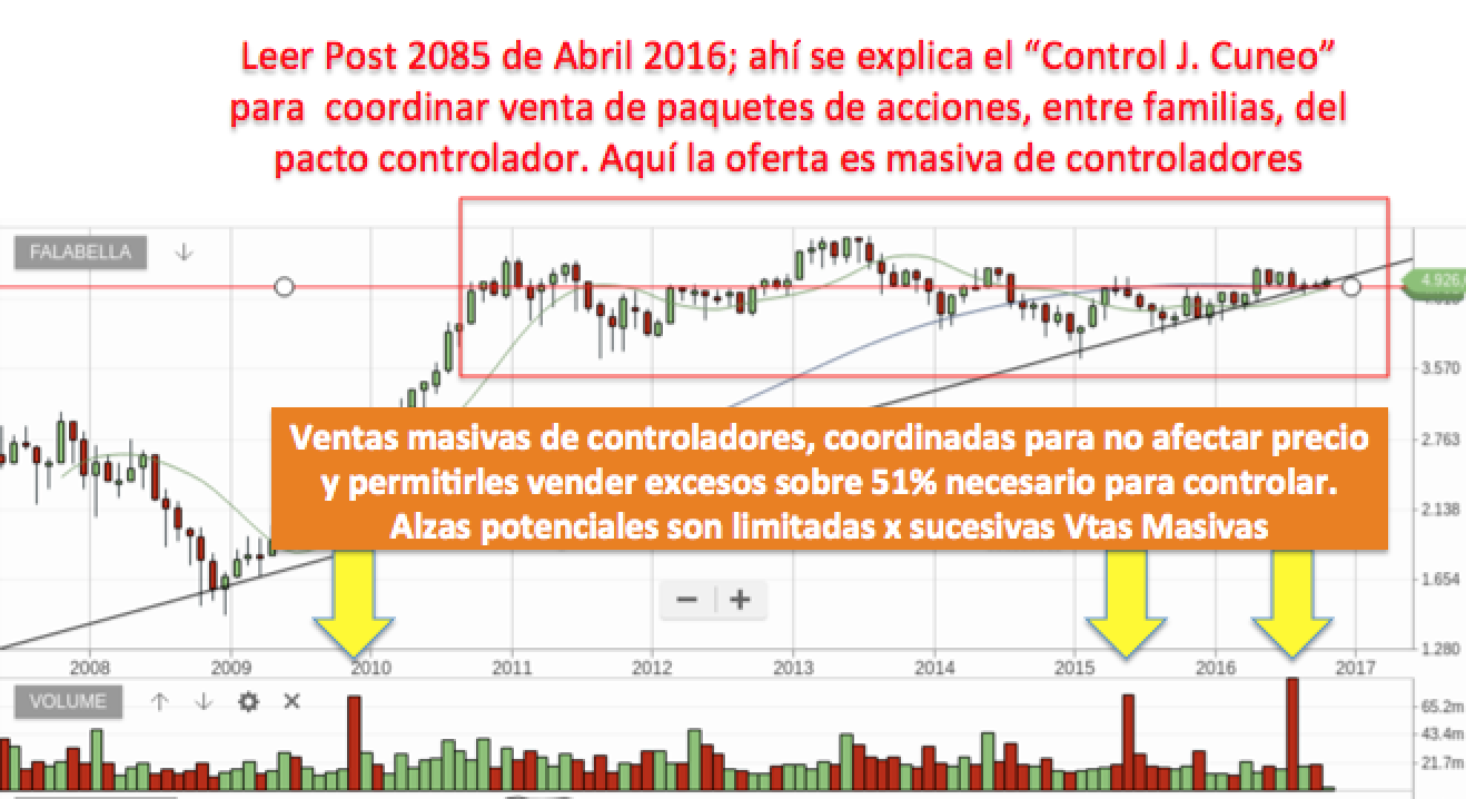 Existen operadores (los controladores) que definen el comportamiento del grafico de precios. El alza de precios tendrá techo hasta que controladores terminen de vender el excedente que les queda (aprox 8,5% de la cia) por sobre el 51% que requieren para controlar.