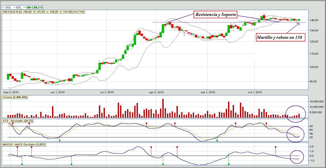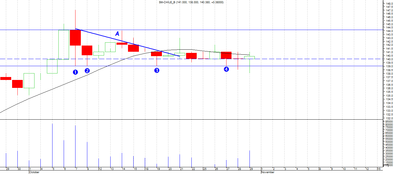 El Estocástico ha dado la vuelta, lo mismo que el MACDO; ambos combinados suelen ser alcistas. El volumen, por otra parte, ha ido en aumento en las últimas 4 sesiones, evidenciado cada vez mayor interés por este papel. El precio de cierre se situó en 141, y ponderado en 140,38, por lo que creo que debería abrir en 141, partiendo entonces con un alza de $0,62, casi un 0,5%.