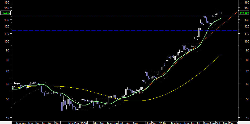 Estimado Chile, lo que indica Fito es correcto. Estás tratando de ver cosas que aun no suceden. Y pueden pasar varios meses en lateralidad una acción pero aquí el punto claro es pasar el rango [144, 145] y espero que eso se de en algún tiempo por mientras te dejo un gráfico semanal, el cual visualiza la situación actual.