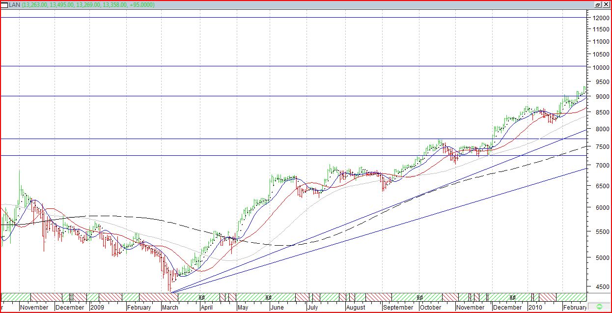 La verdad me subì a este tren a pesar de verlo bien arriba, y solo por la dirección que ya llevaba la tendencia antes de que superara los 9300-9400, "esperaba" que superara este valor, pero claramente ni idea que podría ser "tan ràpido.....y como expliqué al comienzo sólo tengo el gráfico del pueblo (consorcio) y lo que yo vì fue un suelo en 7500.....por tanto originalmente ese era mi stop de referencia, pues no veía otro.