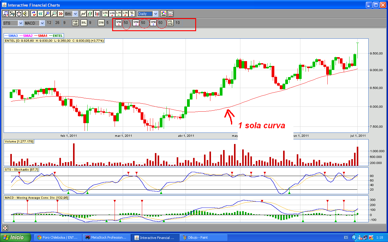 Asi es que, si quieres una media simple de "n" periodos, colocas el n en cualquiera de los casilleros SMAs. Si quieres una media exponencial, colocas el n en el casillero EMA
