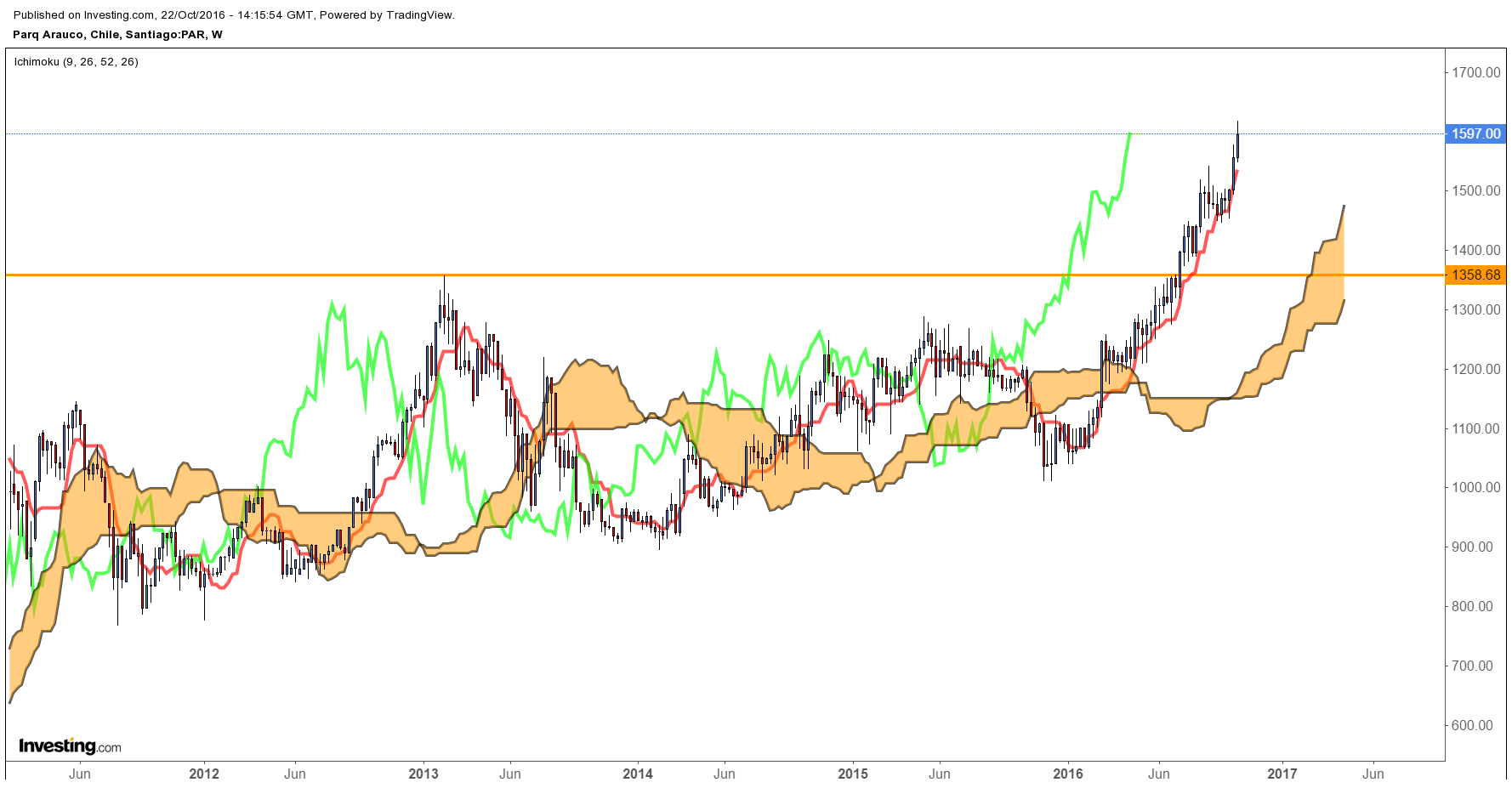 Lleva lateralizando un buen rato pero está en una zona importante, cerca de LTA y Kumo, niveles que han servido como soporte y que han sido respetados todo este tiempo de rally. Nivel de $ 1.450 ha gatillado volumenes importantes de compra, no la han dejado caer. KIJUN (línea roja) está actuando en estos momentos como resistencia.