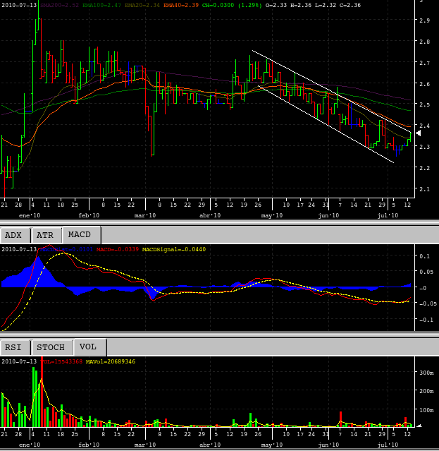 La negra me hizo un guiño en los 2,29 el pasado jueves y de puro califa entré. Pero la reputación de esta negra es muy mala, asi que la tengo cortita, hasta el momento se ha portado como una señorita, mejor que ripley, endesa, enersis y un monton de acciones muy bien recomendadas... espero que se comporte y asiente cabeza mi negrita...