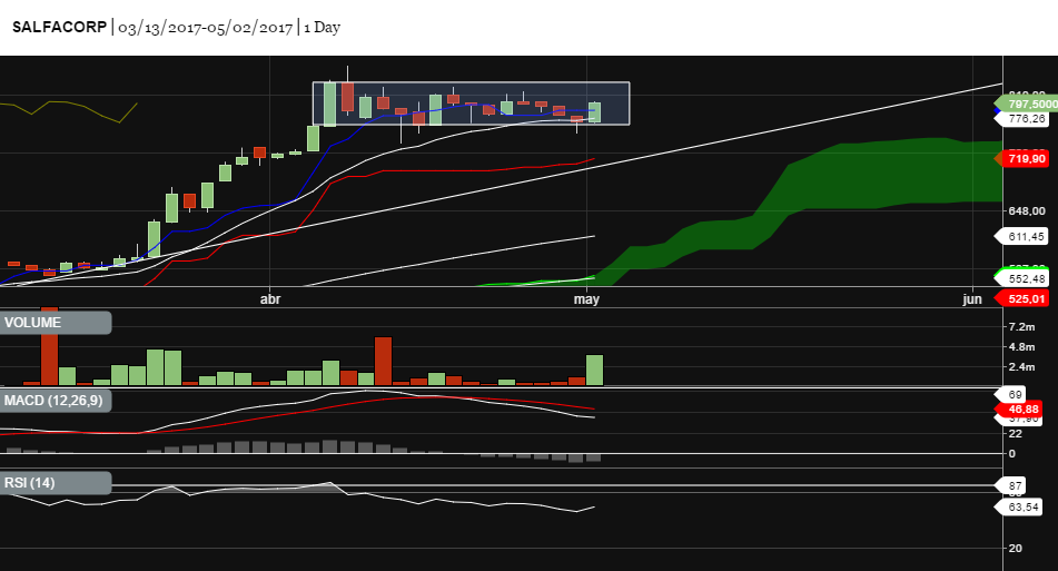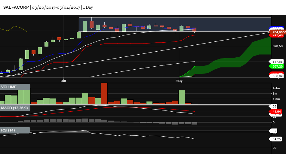 Va impecable, dentro del cajon, rebotó en la resistencia. Aunque estoy fuera de Salfa la miro todos los dias, es la que mas me gusta,  como estoy fuera le veo lo debil; no sobrepaso los $ 800 como en oportunidad anterior, en la que tuvo mas fuerza, de confirmarse mañana podría comenzar a declinar nuevamente. (ojala para que de mas tiempo para entrar), pero claramente los $ 765 son full soporte...