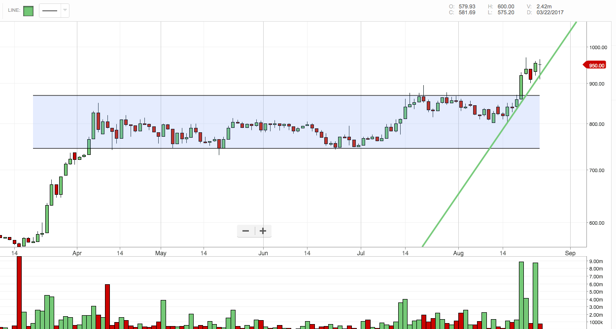 Se ve bien la acción, por ahora en una estrecha zona. A mí modo de ver, una caída bajo $900 da salida, un cierre sobre $970 daría continuidad al impulso alcista actual.