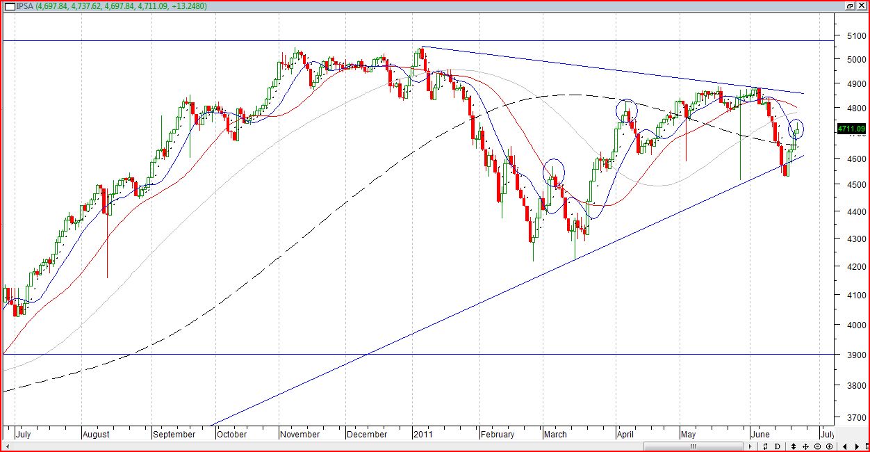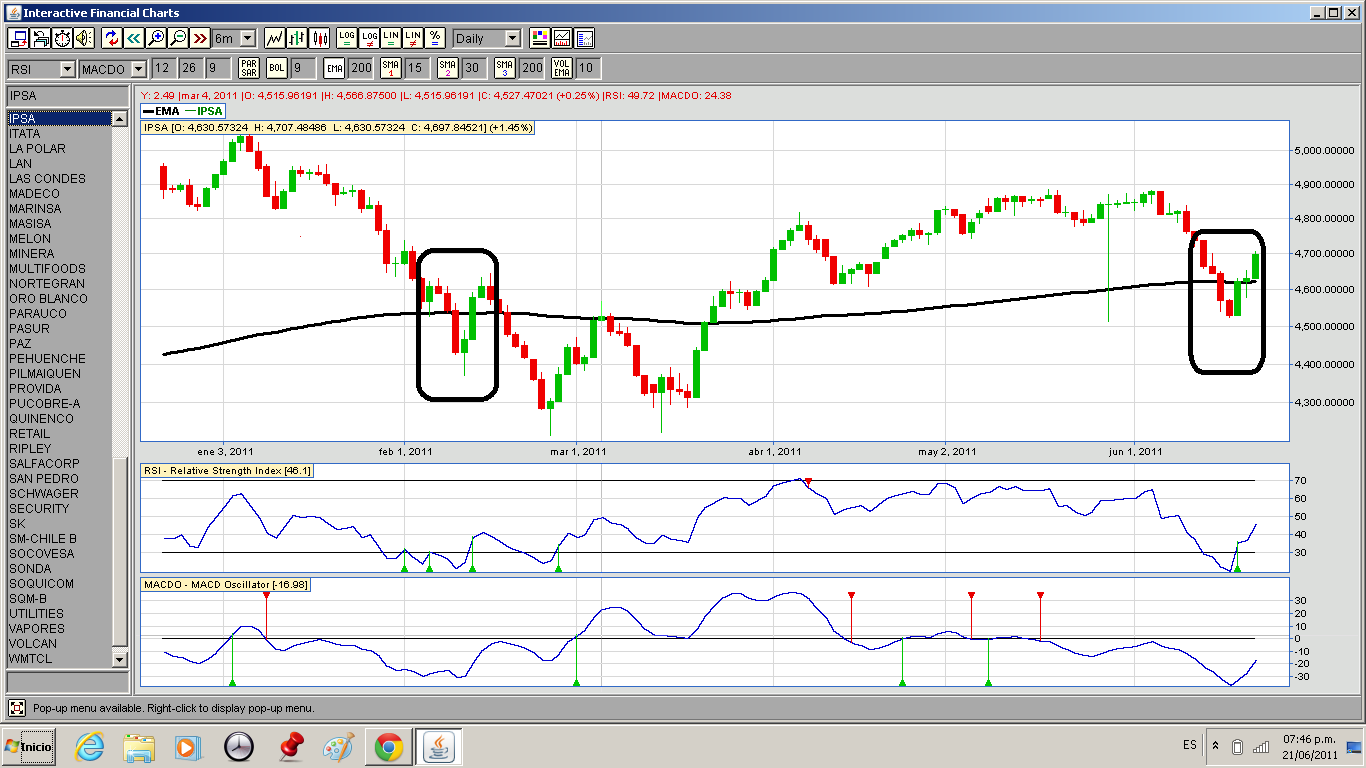 Algo que nos pasa a menudo es olvidar que el mercado reacciona a situaciones no siempre predecibles, cuando nuestro IPSA cae veo muchos comentarios de porqué cae, como si no tuviera que hacerlo.....Sin embargo cuando nuestro IPSA tiene algún rebote, extrañamente los comentarios cambian de sentido, como olvidando que esto da muchas vueltas. No es mi intención ser negativo, nunca lo he sido, sin embargo les subo este gráfico para que no olviden que ya hemos estado en esta situación, si bien más de alguien dirá "lo que pasó ayer no tiene porque pasar mañana", no está demás estar atentos a cualquier cambio en la tendencia.