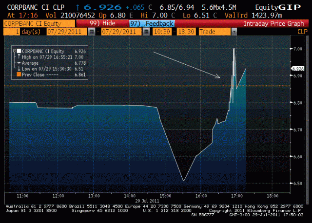 Agunos desdesperados queriendo presionar las acciones de bancos para arriba en los ultimos minutos. Eso tiene una lectura clara para mi : posicion tecnica muy negativa para los bancos. El mercado en general muy comprado y queriendo "marcar" para arriba en los ultimos minutos del mes de julio. No veo ningun upside para estos papeles. Ademas de ya estar caros, no tenemos mucho espacio para compras estructurales, solamente este tipo de compras/ventas que no obedecen a ningun fundamento y si a la necesidad de algunos de cerrar el mes un poco mejor. El grafico "intraday" habla por si mismo.