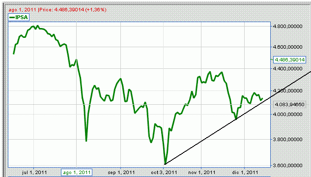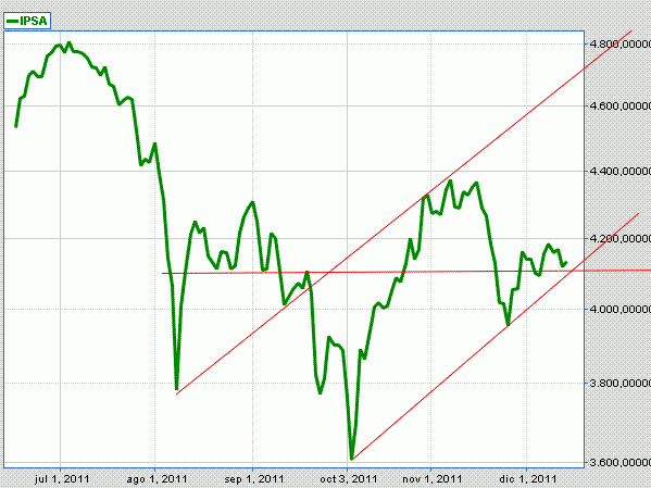 Creo que las EMA que muestran en la grafica nos confirman que estamos en un canal entre los 4000 a 4200, los que no hemos podido romper desde la caída que sufrimos en NOV. A un mes nuevamente creo que hoy el IPSA buscara pasar los 4200, y creo que nuevamente nos quedamos con las ganas este fin de semana... lo malo es que llevamos mucho tiempo estancados donde mismo y si no fuera por algunos papeles que pesan bastante en el IPSA que no han andado tan mal estaríamos peor, esta difícil la cosa.