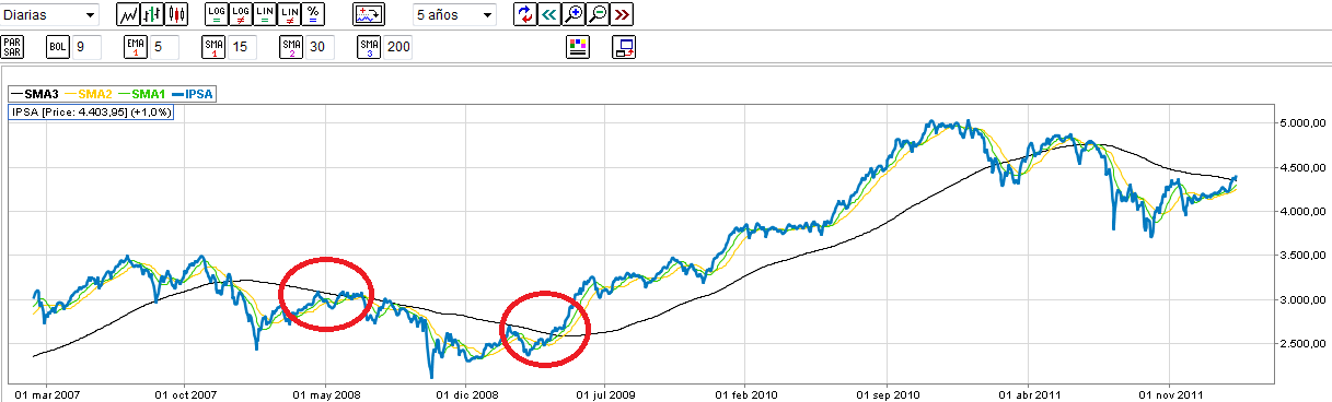 Un puñado de acciones que pesa bastante en el índice tuvo bajas (Entel, CMPC, CAP, Copec, Enersis). Pero no todas las más transadas bajaron, ya que subieron Cencosud, LAN y Bsantander. Yo rescato que por tercer día consecutivo el IPSA está tocando su media de 200 días, lo que no ocurría desde julio del año pasado y podría ser -tal vez, ojalá- una señal de fin del proceso bajista.