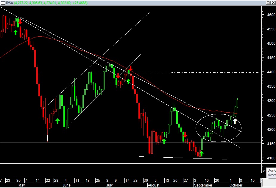 La Bolsa de Santiago, en Chile, continuó ayer con los movimientos alcistas. El IPSA, que agrupa las 40 principales acciones del mercado local, subió un 0,79%, ubicándose en los 4.277,22 puntos, impulsado por un avance en los títulos del sector bancario y en línea con el alza de Wall Street. El IPSA se encuentra actualmente en una tendencia alcista que tiene por objetivo los 4.300 puntos, encontrando soporte en la zona de los 4.180. De traspasar la resistencia, se abren las puertas para un rally hasta los 4.700 puntos.