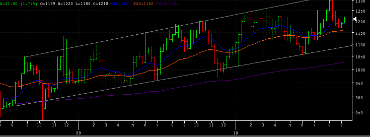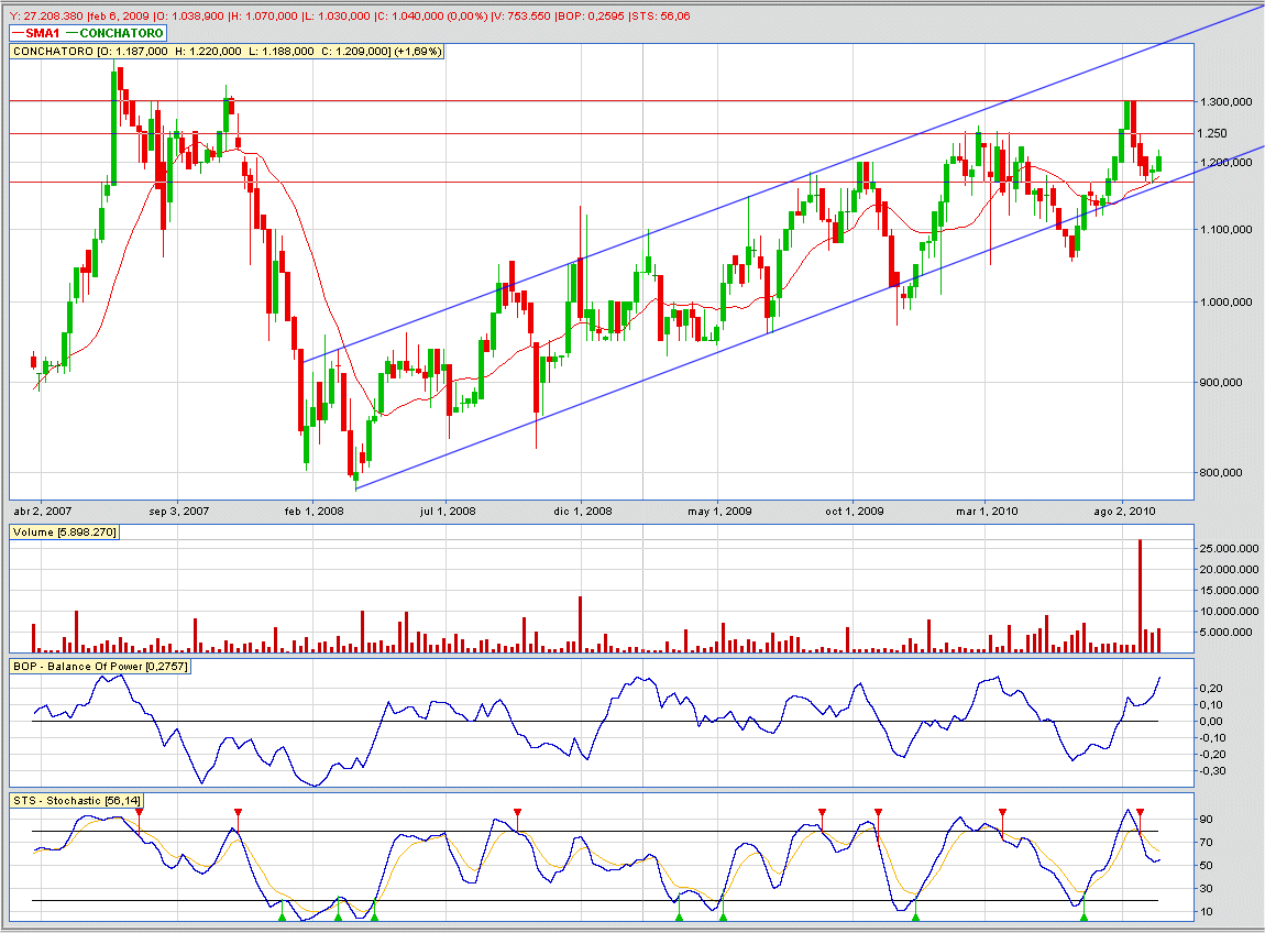 Estimados, este papelito podrìa llegar a los 1.300 en mediano plazo y si siguise con el patron alcista que tiene desde principios del 2008 perfectamente podrìa romperlos. Antes de los 1.300 veo resistencia en 1.250. Adjunto gràfico semanal con lo indicado, Balance of Power figura con fuerza compradora o alcista, y el volumen de las ùltimas sesiones para considerar. La linea roja es la MM de 15.