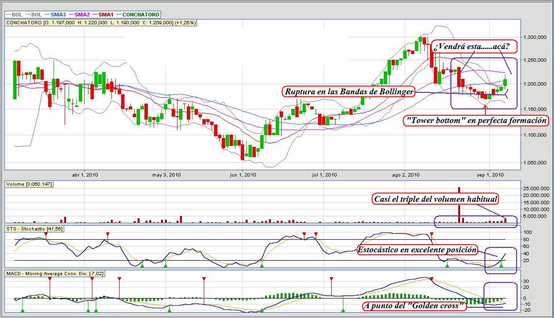 1.- Cuando publique un grafico trate que estos sean lo mas limpios posibles, sencillos pero practico, usted pone muchas cosas que ensucian su trabajo, mirando su grafica de conchatoro me costo ver las bandas de bollinger y otras cosas.