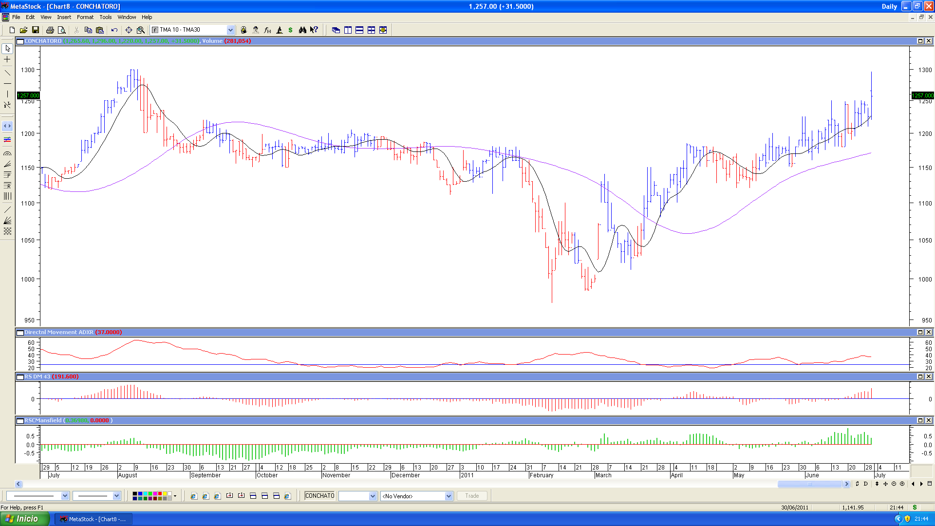 Ni un peso mas, ni un peso menos. Se encuentra justo sobre la MM de 10 semanas, la que sería para los operadores, según Stan Weinstein, quedándole todavía un margen hasta que caiga hasta la MM 30 semanas.