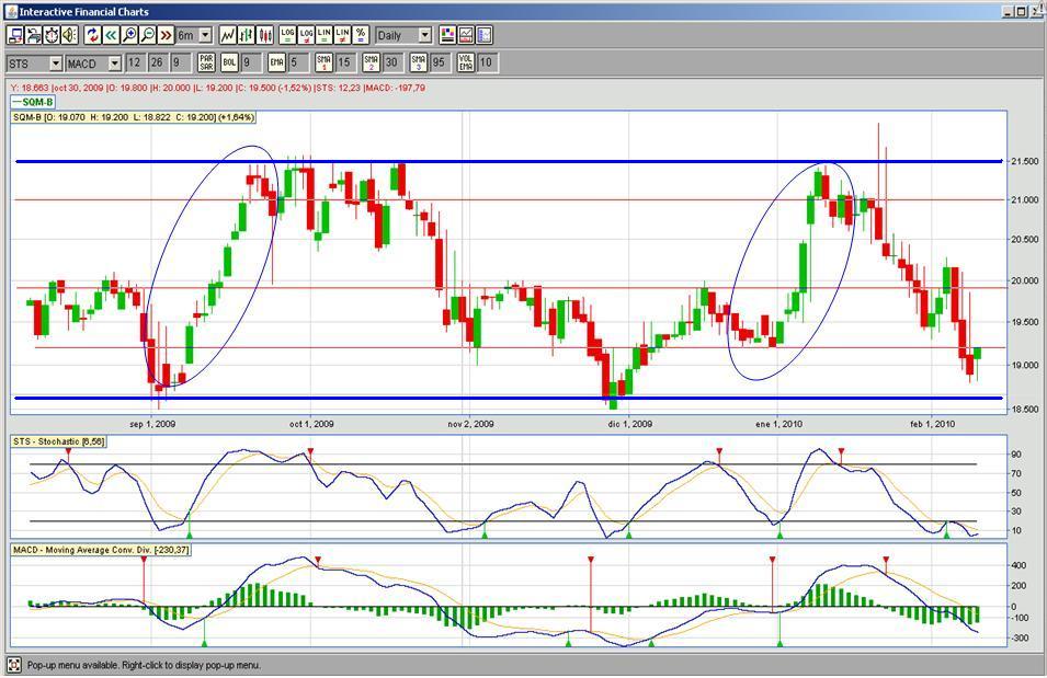 Edas, hace rato que sqm esta metida en un canal lateral 18500-22000 lucas. Muy volatil, muy rapida, y por lo general, sin poder aplicar mucho indicadores, ya que dan señales erroneas. STS me parece que anda bien con sqm.