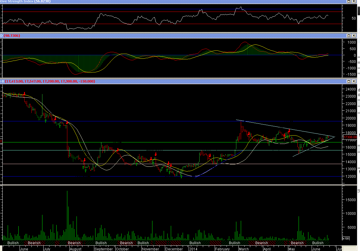 Debe resolver la cuña descendente, ruptura sobre 18.000.- fíjense en la caída del volumen y en la tendencia del RSI y MACD.