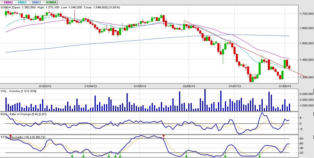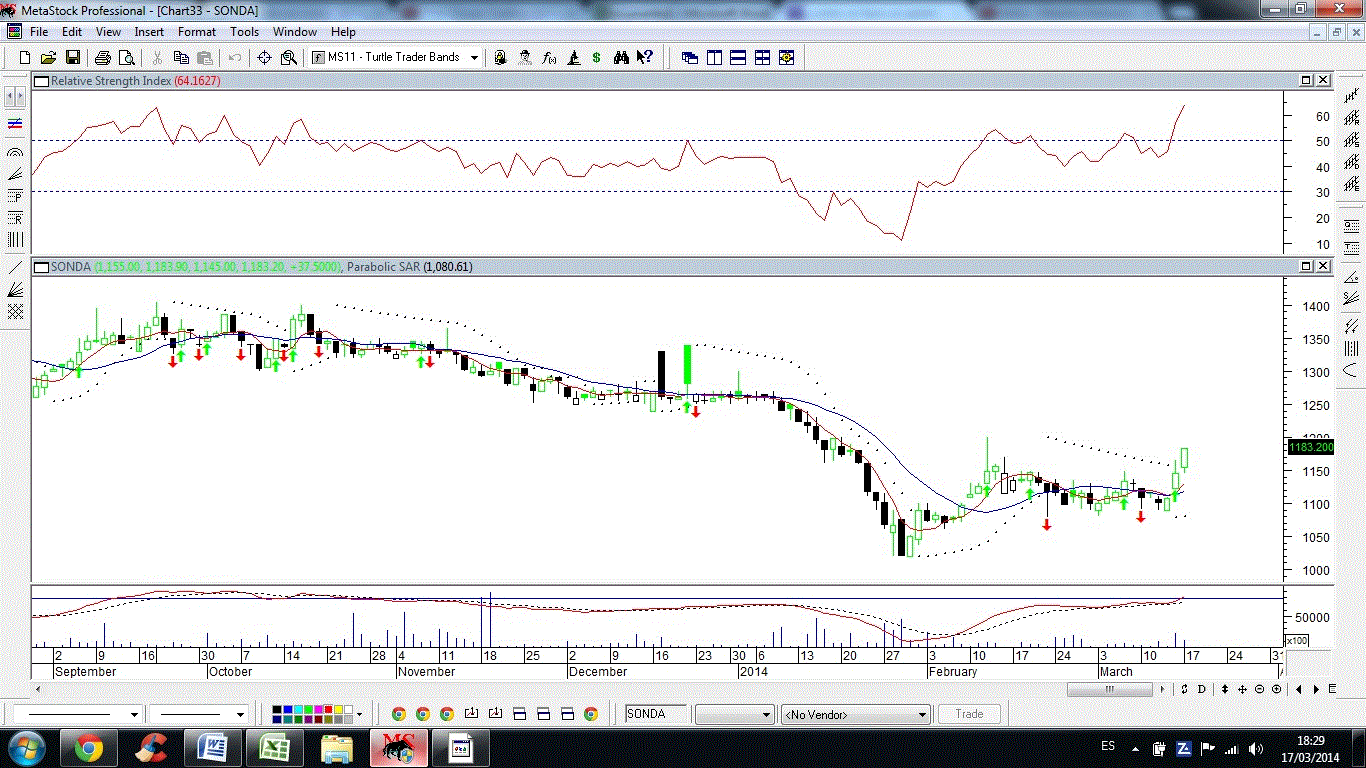 ....lo q sucedió con sonda creo yo le puedes agregar el análisis financiero(fundamental) q sería lo ocurrido unos días atrás q SONDA compró una empresa brasileña...y ahora se elevo su apreciación del mercado...por esta razón análisis bursatil= AT+AF...y por eso hoy se inicia el parabolic sar ascendente para SONDA