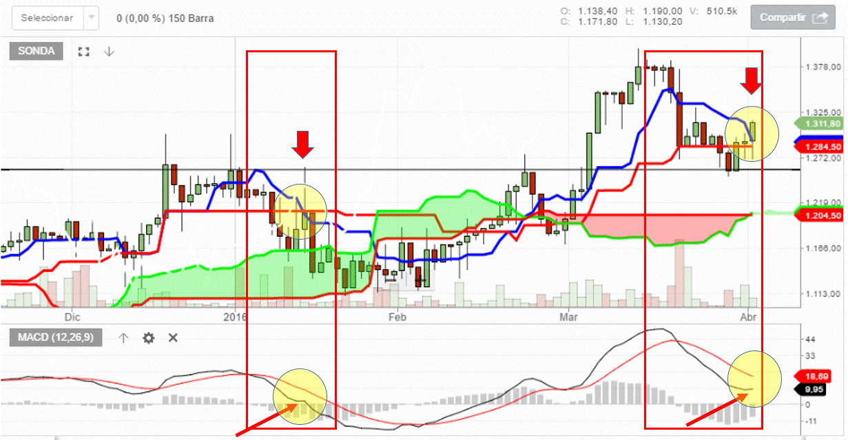 La curva Tenkan- Sen (Color Azul) por cruzar a la curva Kijun-Sen (roja) a punto de mostrar la señal de salida, situación muy similar a Enero, destacado en rectángulos y con flechas azules. Aún el MACD no está entregando una señal clara, en enero entregaron una señal a mi parecer errónea al proyectar se espera un pronto cruce lo cual finalmente no ocurrió y prevaleció la señal del cruce del Tenkan sobre Kijun que al parcer es más potente, por lo menos en esta acción.