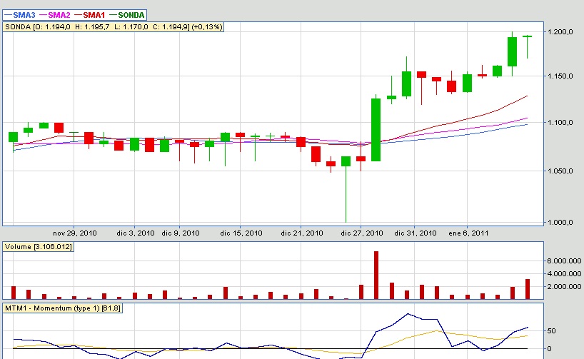Sonda hoy termino con una fuerza interesante para observarla mañana.. en un dia aun con temores llegó a estar -2%, y recupero terminando el dia con compras en 1.195, 0,1% superior a la apertura considerando una fuerte compra a 1190 en los ultimos 10 minutos la llevo a ajustar el cierre en 1190.