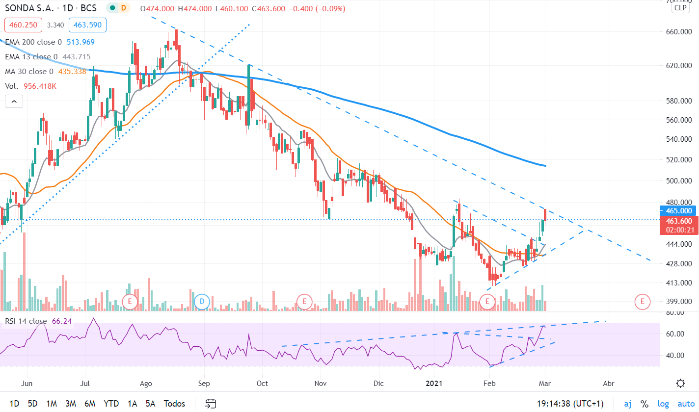 SONDA semanal, ya se esta mostrando hacia donde se dirige, la divergencia algo anunciaba, la figura de doble piso comienza a consolidarse, por otra parte aparece el volumen durante las ultimas semanas y se puede observar que una vez que el papel logra cortar el RSI al alza, viene seguido de alza del papel. Quizás cuando sobrepase la EMA 30 periodos la señal sea más confiable para los conservadores. Aunque en la temporalidad diaria esta ya fue superada.